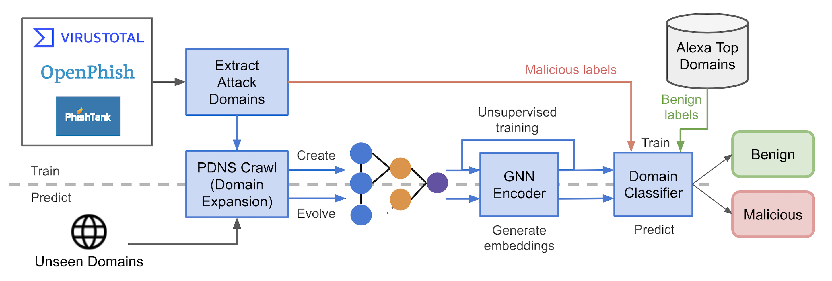 Blocklist-Forecast: Proactive Domain Blocklisting by Identifying Malicious Hosting InfrastructureUdesh Kumarasinghe, Mohamed Nabeel, and Charitha ElvitigalaIn Proceedings of the 27th International Symposium on Research in Attacks, Intrusions and Defenses 2024Domain blocklists play an important role in blocking malicious domains reaching users. However, existing blocklists are reactive in nature and slow to react to attacks, by which time the damage is already caused. This is mainly due to the fact that existing blocklists and reputation systems rely on either website content or user interactions with the websites in order to ascertain if a website is malicious. In this work, we explore the possibility of predicting malicious domains proactively, given a seed list of malicious domains from such reactive blocklists. We observe that malicious domains often share the infrastructure utilized for previous attacks, reuse or rotate resources. Leveraging this observation, we selectively crawl passive DNS data to identify domains in the "neighborhood" of seed malicious domains extracted from reactive blocklists. Due to the increased utilization of cloud hosting, not all such domains in the neighborhood are malicious. Further vetting is required to identify unseen malicious domains. Along with the proximity, we identify that hosting and lexical features help distinguish malicious domains from benign ones. We model the infrastructure as a heterogeneous network graph and design a graph neural network to detect malicious domains. Our approach is blocklist-agnostic in that it can work with any blocklist and detect new malicious domains. We demonstrate our approach utilizing 7 month longitudinal data from three popular blocklists, PhishTank, OpenPhish, and VirusTotal. Our experimental results show that, our approach for VirusTotal feed detects 4.7 unseen malicious domains for every seed malicious domain at a very low FPR of 0.059. Further, we observe the concerning trend that 47% of predicted malicious domains that are later flagged in VirusTotal are identified only after more than 3 weeks to months since our model detects them.